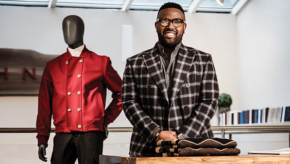 Waraire Boswell of the brand Waraire creates custom suits and outerwear for clients, featuring classic shapes in bold patterns and colors. He also has a line of t-shirts to cater to more casual customers.