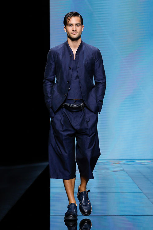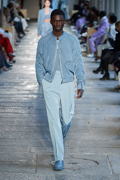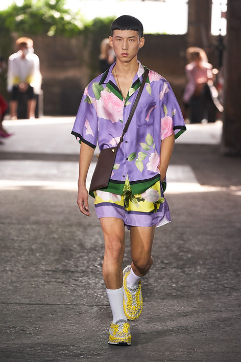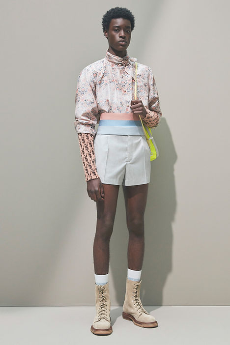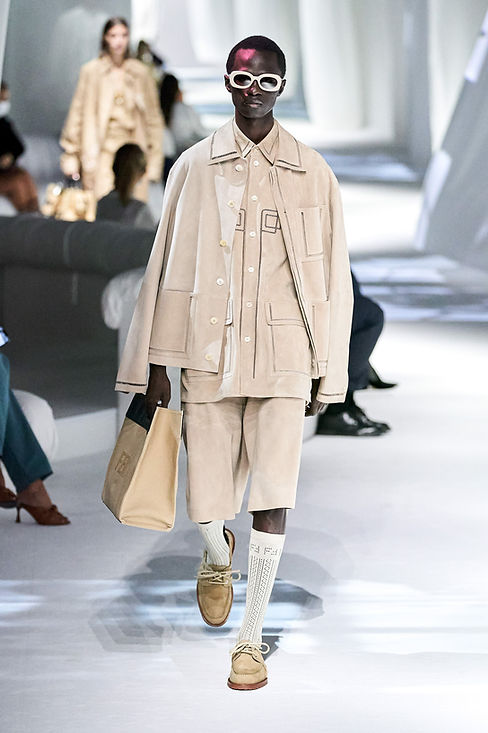 One of the more interesting trends of Spring 2021 involved what can be described as proportion play. Designers took a lot of creative leeway this season, mixing pieces of contrasting size together in the same looks. A key component of some of these outfits was what could be described as the shirt-dress for men, button-down shirts, or tunics with lengths past the knee. They were mixed with blazers stopping right below the waist area, an unconventional pairing as blazers are usually designed to fall below the waist where shirts usually stop or are tucked-in. We also saw oversized tops such as parkas and different styles of jackets mixed with slimmer bottoms such as considerably short shorts during the presentations.