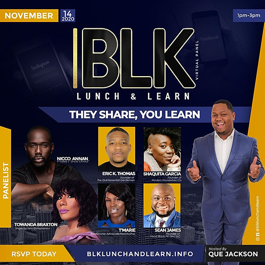 2020 has proved that we are a culture of value and our stories are even more valuable. The #BLKLunchandLearn will remain true by continuing to bring the real gatekeepers of the industry to create a teachable environment for students of all ages who are willing to learn. This event is powered by Quente’sential Branding and hosted by the founder Que Jackson. Guests will be virtually treated to a panel discussion and audience Q&A. The audience can expect a “They Teach. You Learn” experience with some of the industry greats including Nicco Annan, star of Starz’s P-Valley, Towanda Braxton, Multifaceted Entrepreneur/Television Personality, Eric K. Thomas, founder of The Quintessential Gentleman, T’Marie, Relationship Advocate/Host/Author, Shaquita Garcia, founder of Modern Housewives Co. and Sean James, public relations professional.
