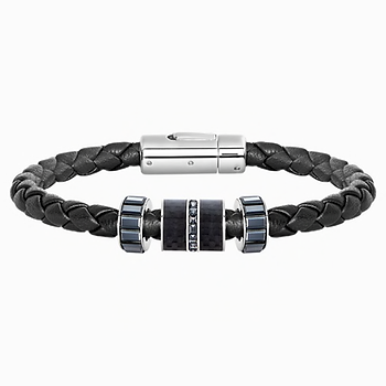 Stand out with this braided black leather bracelet for a fashionable, masculine look. This Swarovski design with a rhodium-plated closure is embellished with three beads at the front featuring clear crystal and black PVD metal. Available in two sizes (M and L). $129