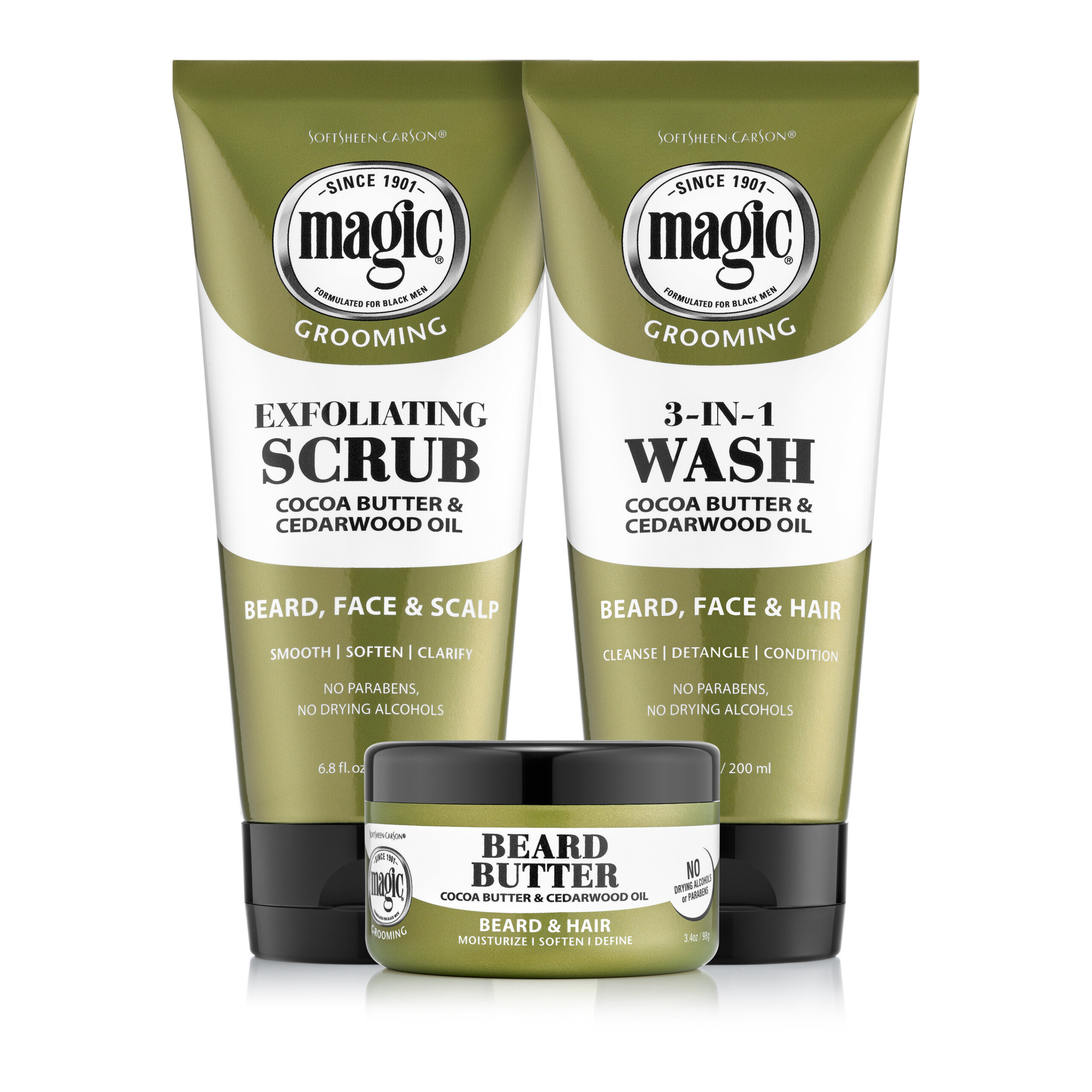 Infused with cocoa butter and cedarwood oil, and without parabens or drying alcohols, the Magic Grooming Collection is specially formulated to moisturize, provide touchable softness and keep facial hair looking exactly the way you want.