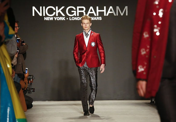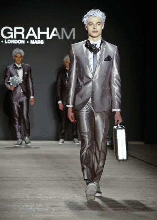 Designer Nick Graham sent his models down a runway Tuesday in sharkskin suits, metallic rainwear and scarfs adorned with tiny spaceships in a whimsical bid to elegantly dress any gentlemen who manages to get to Mars.