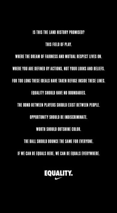EQUALITY is centered on using Nike’s voice and the power of sport to inspire people to take action in their communities, with Nike leading by example with its recently announced partnerships with world-class organizations dedicated to advancing this work.