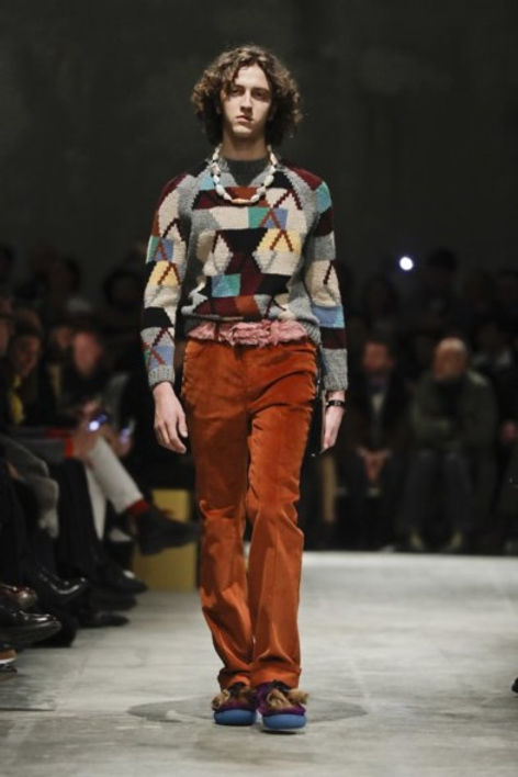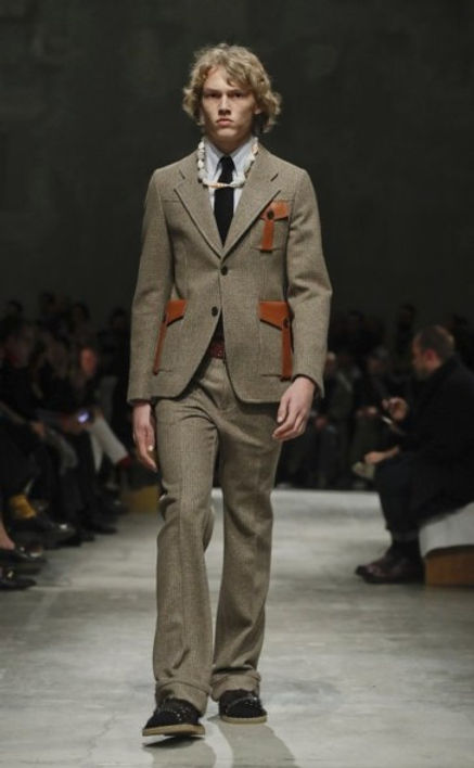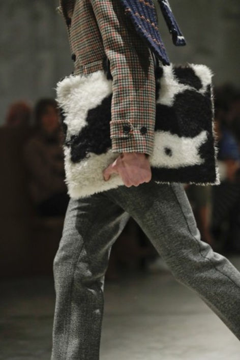 Amulets of shells, stones or branches that Prada said she plucked from the woods herself accented the looks for both men and women. Colors stayed in a 1970s design palette of brown, tans, rust and orange, breaking out for richly hued purple and blood-red furs. Bags included hard cases or oversized document holders in cow’s skin.