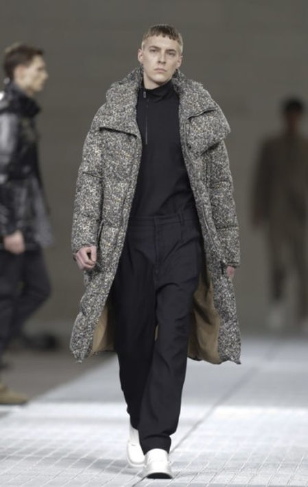 Cargo pants had a jean fit, creating a workman look when worn with a boxy jacket. Zip up turtlenecks offered extra protection against the elements under suits. Shearling jackets and parkas balanced volume with slim leggings.