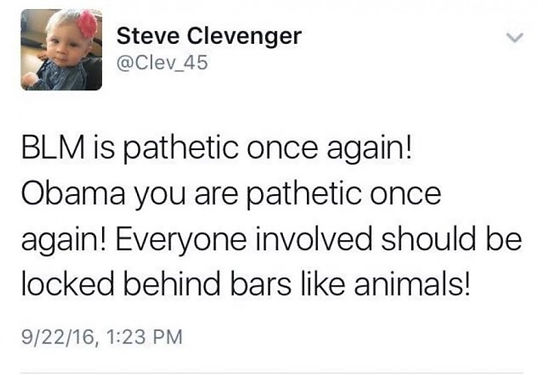 Yes, people are comparing Kaepernick kneeling during the national anthem to protest police brutality, to Clevenger likening protestors and President Obama to animals. The Charlotte protests began after police shot and killed Keith Lamont Scott, a black man, who according to witnesses, was reading a book in his car before the incident occurred. Police said Scott had a gun. Clevenger has since apologized for what he calls mis-wording his tweets and being a distraction to his teammates. He also added that he is not racist, being that he grew up in Baltimore. “I grew up on the streets of Baltimore, a city I love to this very day,” Clevenger said in a statement first released to Fox Sports. “I grew up in a very culturally diverse area of America and I am very proud to come from there. I am also proud that my inner circle of friends has never been defined by race but by the content of their character. Any former teammate or anyone who has met me can attest to this and I pride myself on not being a judgemental person. I just ask that the public not judge me because of an ill worded tweet. “I do believe that supporting our First Amendment rights and supporting local law enforcement are not mutually exclusive. With everything going on in the world I really just want what is best for everyone regardless of who they are. I like many Americans are frustrated by a lot of things in the world and I would like to be a part of the dialogue moving forward to make this a better world for everyone. I once again apologize to anyone who was offended today and I just ask you not judge me off of a social media posting. Thank you and God bless everyone.”